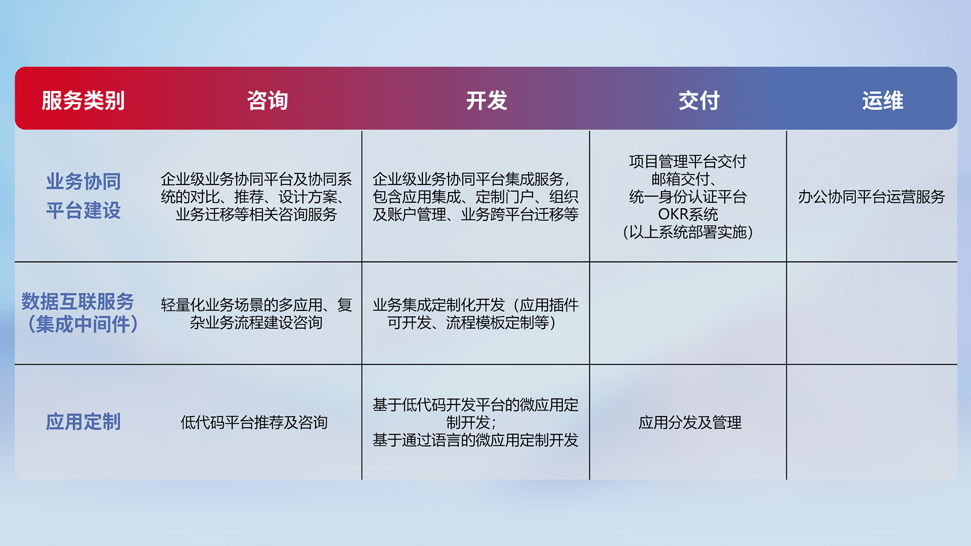 针对钉钉、、企微、、、IDaas等平台级产品提供产品的规划、、、、方案、、交付、、、定制化开发等服务,,实现如统一协同办公、、智能客户服务、、、、混合会议管理、、、、智能数据查询、、、等业务场景,,,,实现数字化转型。。。。