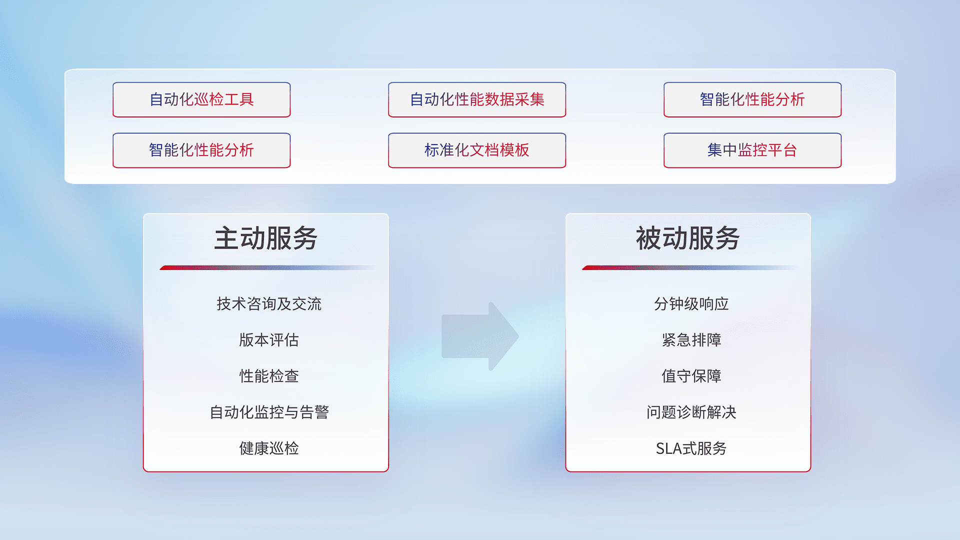 智能化工具和标准化文档,,保障服务质量,,,,提供主动服务(包含技术咨询、、、版本评估、、性能检查、、自动化监控与告警、、、健康巡检)和被动服务包含(分钟级响应、、、、紧急排障、、、值守保障、、、问题诊断解决、、、SLA服务)。。。。
